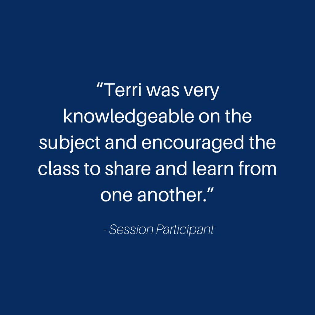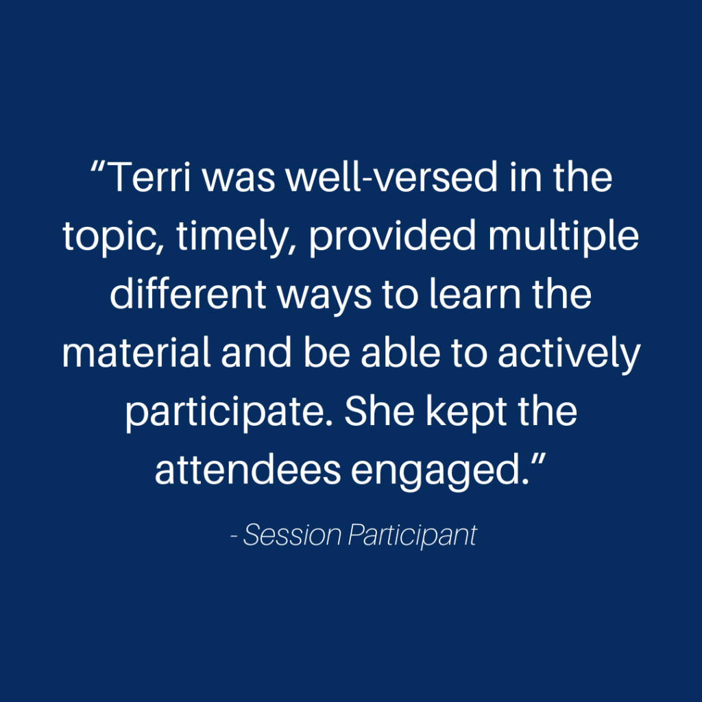 Throughout her career, Terri has adeptly facilitated a range of learning opportunities, from small, focused cohorts to large-scale company-wide events, serving employees at all levels. Proficient in utilizing platforms such as Zoom and Teams, she excels in virtual training, ensuring that each session is both interactive and engaging. Terri is skilled at creating an inclusive environment for hybrid events, seamlessly integrating virtual and in-person participants. She also manages challenging questions with ease, providing thoughtful and comprehensive responses to maintain a positive and productive learning experience. Terri’s dedication to addressing diverse learning needs ensures that every participant gains the knowledge and skills necessary to succeed.